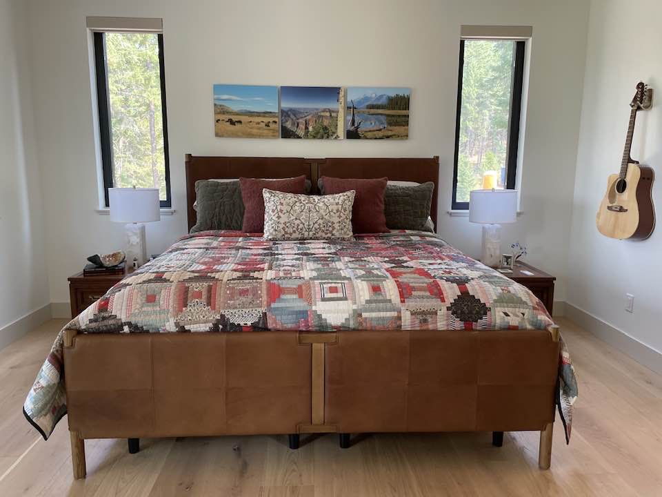 We absolutely love the leather and oak, Sunita Leather Platform Bed by Birch Lane. While on the pricey side at $2,800 this platform bed showcases contrasting materials and clean lines that add plenty of textural interest to our room. The spacious frame is crafted from solid ash and engineered wood, and both the headboard and footboard are padded with genuine top grain leather upholstery with plenty of weathering for a rustic, lived-in look. Designed to accommodate a mattress without the need for a box spring, this bed includes wooden slats for support and has a weight capacity of 550 lbs. As I mentioned earlier, we went with the adjustable bed platform, which is placed inside the frame of this bed. It looks great, but it also made the bed higher than it would have been if we used a different mattress. This King bed was more difficult to assemble than the other two Queen beds we ordered from Wayfair.