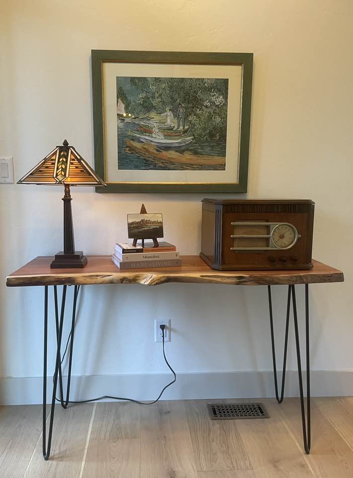 We brought the console table and Van Gogh print with us, but the vintage Tiffany style lamp, Radio/Record Player and bathroom rug were found in local vintage shops.