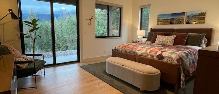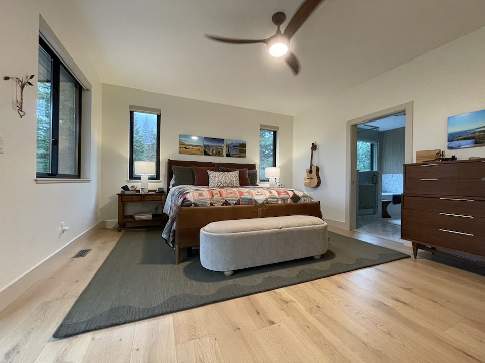 Additional goals for our build, included large windows, natural materials and a home inspired by mid-century modern design. For the primary bedroom specifically, we designed a generous space with access to a covered patio and the outdoors beyond. The bedroom also has a walk-in closet and five-piece bathroom. You can read about and see more of the bathroom below: