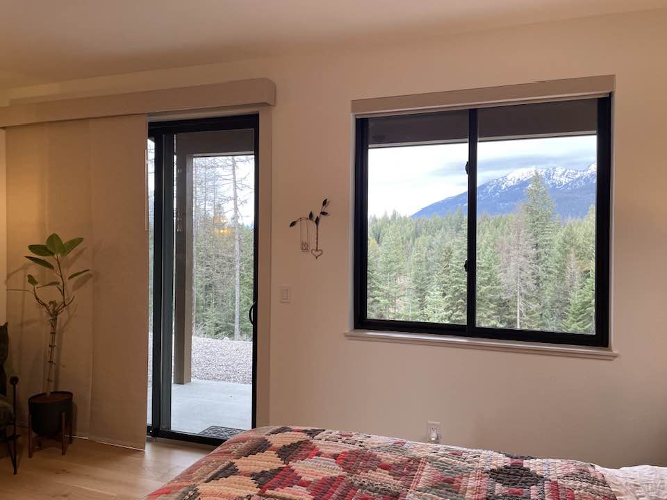 We prefer the almost invisible, clean lines of blinds to curtains in our space. We chose locally owned and operated Budget Blinds to provide blinds for our whole house. The neutral color is a tad darker than the Greek Villa wall color. The bedroom blinds and one above the tub in the primary bath are remotely operated making them easy to open and close every day. The sliding door has matching panels, which look great by don’t feel very sturdy. They haven’t broken, but we have needed to adjust them twice already. In spite of the panels, I recommend Budget Blinds for the quality, service and many style choices available. You can see the sliding door panels partially closed and open window blind in the picture below: