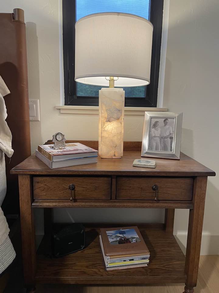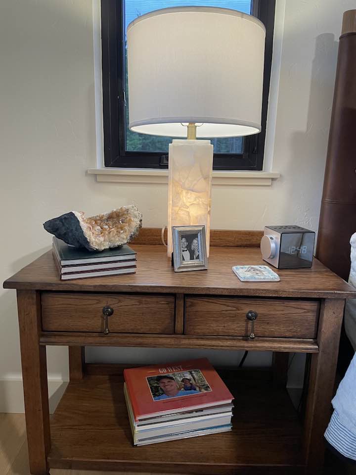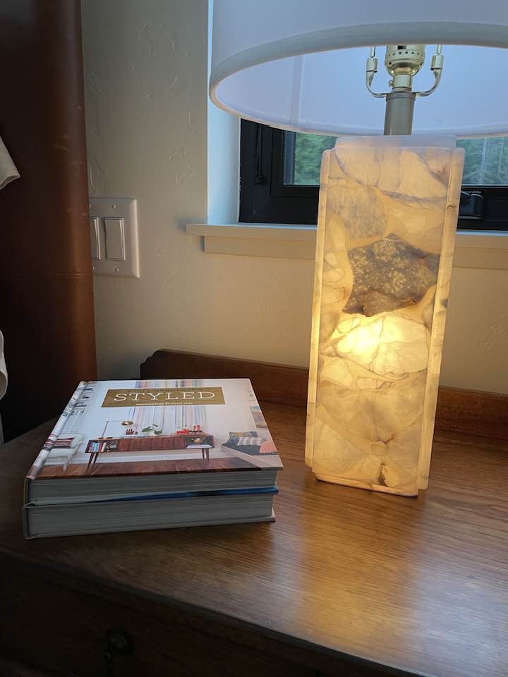 Lighting is important in every space, but in your bedroom, you’ll want to ensure you have both overhead and ambient lighting. As you can see above, we also added task lighting next to the chair, which works great for reading or sewing on a button. We also have dimmable wall sconces providing ambient lighting for this space. The bedside lamps could also be used for reading. Table lamps should take up about one-third of the nightstand top. To avoid glare in your eyes while sitting up, the bottom of the shade should be around chin level. Finally, we have additional lighting at the ceiling with a modern fan and light combination. All of our lighting can be controlled with switches located next to the bed. This saves you from having to get out of bed or walk around in the dark. The alabaster table lamps pictured below were found at HomeGoods. The alabaster stone base is lighted, so when we want to create a cozy vibe, we turn off the upper bulb and just use the light in the base.