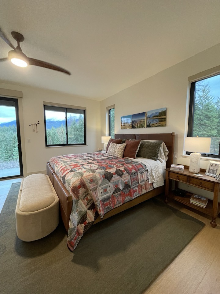 The 2,125 square foot home we built in NW Montana is one level and will work great for aging in place. It has no stairs on the outside or inside of the house. It also has wider doorways and hallways than standard builds. When my husband, Jim and I were designing the floorplan on SketchUp, we had several goals, which included a first-floor primary bedroom and the ability to age in place. We actually created about seven different floorplans before we were satisfied with the final one.