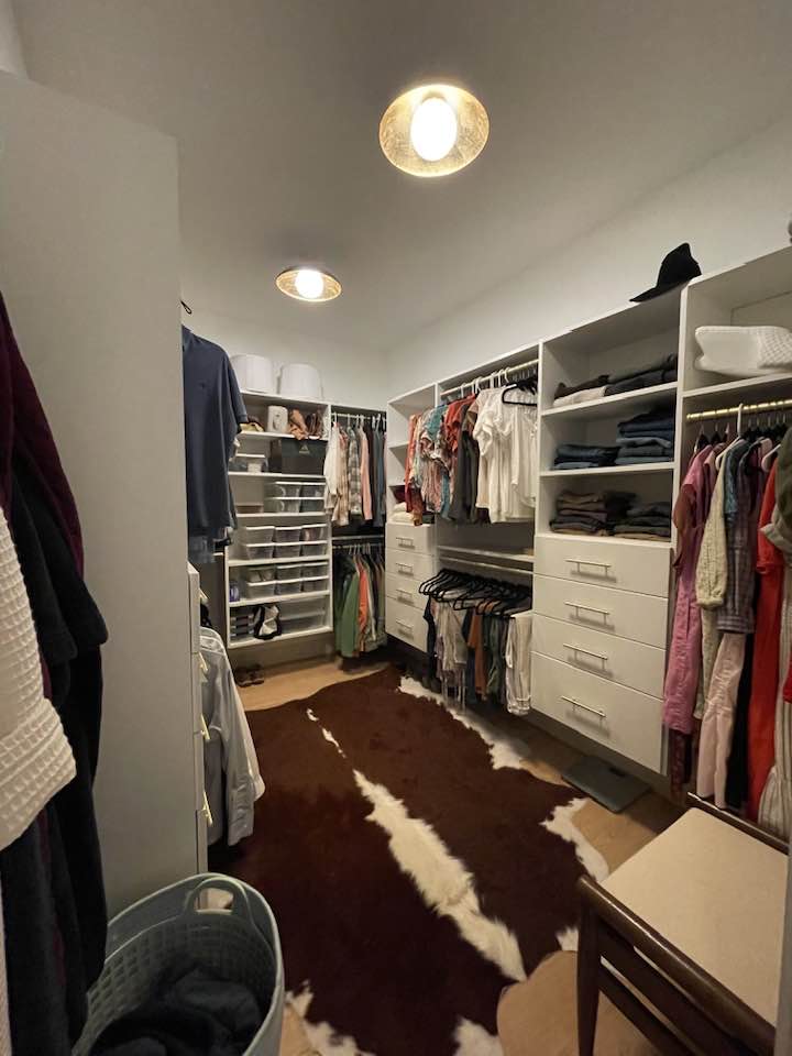We customized our primary closet to fit our needs. The space includes double hanging areas, drawers, shelves and a single rod hanging for long dresses. We added walnut hooks to store hats and robes. A genuine cow hide adds interest and feels comfy. We even fit a small, upholstered bench and hamper.