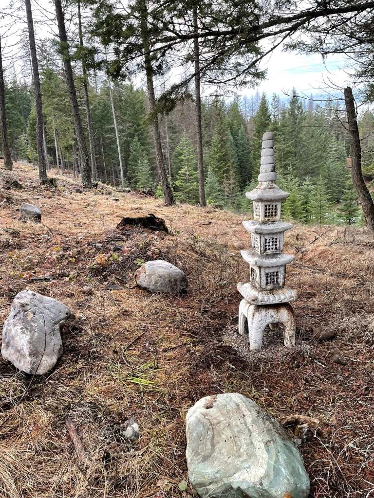 We’ve just begun the trail around our 12.5-acre property. It starts in the east garden where Jim has used a small brush cutter to clear a path. The pagoda is the first piece of art we’ve added to the garden. Adding objects with special meaning ensures your garden will be unique and reflective of you. The trail will continue down the slope to a perch overlooking a large meadow and Swan Range mountains. Here is the inspiration for the perch: