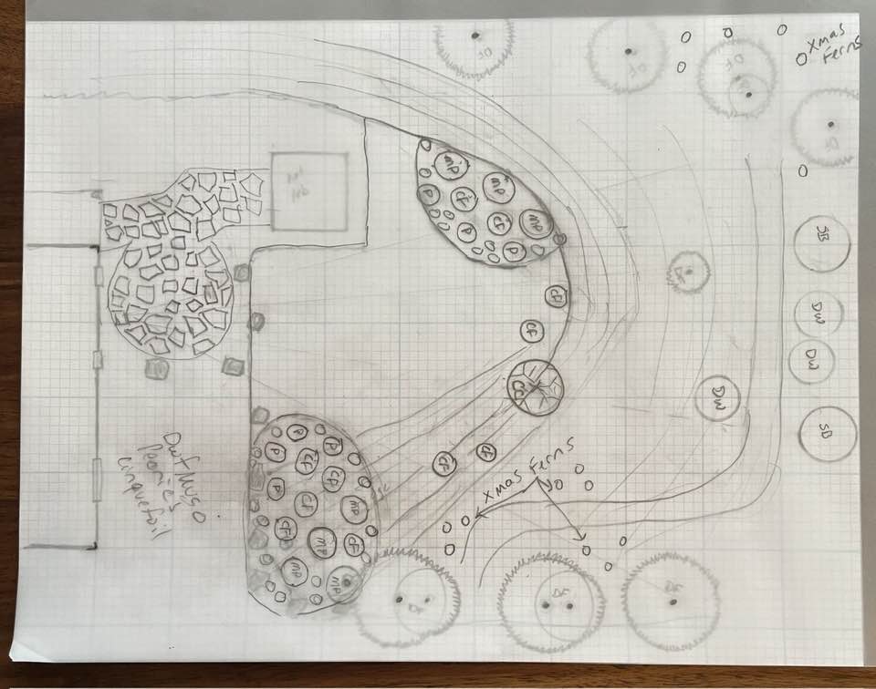 In the above drawing, you can also see the flagstone pathway to the Bullfrog hot tub and sunny sitting area. This area would also be a great spot for a water feature. The yard slopes down to the right, where our trail starts and leads to a pagoda, which we inherited from Jim’s mom. It sits under and is surrounded by Douglas Firs. Conifers are prevalent in Asian gardens, and we may prune or shape a few baby firs in this area. Finally, we’ll repeat the Christmas Ferns, which will help tie the east and north gardens together.