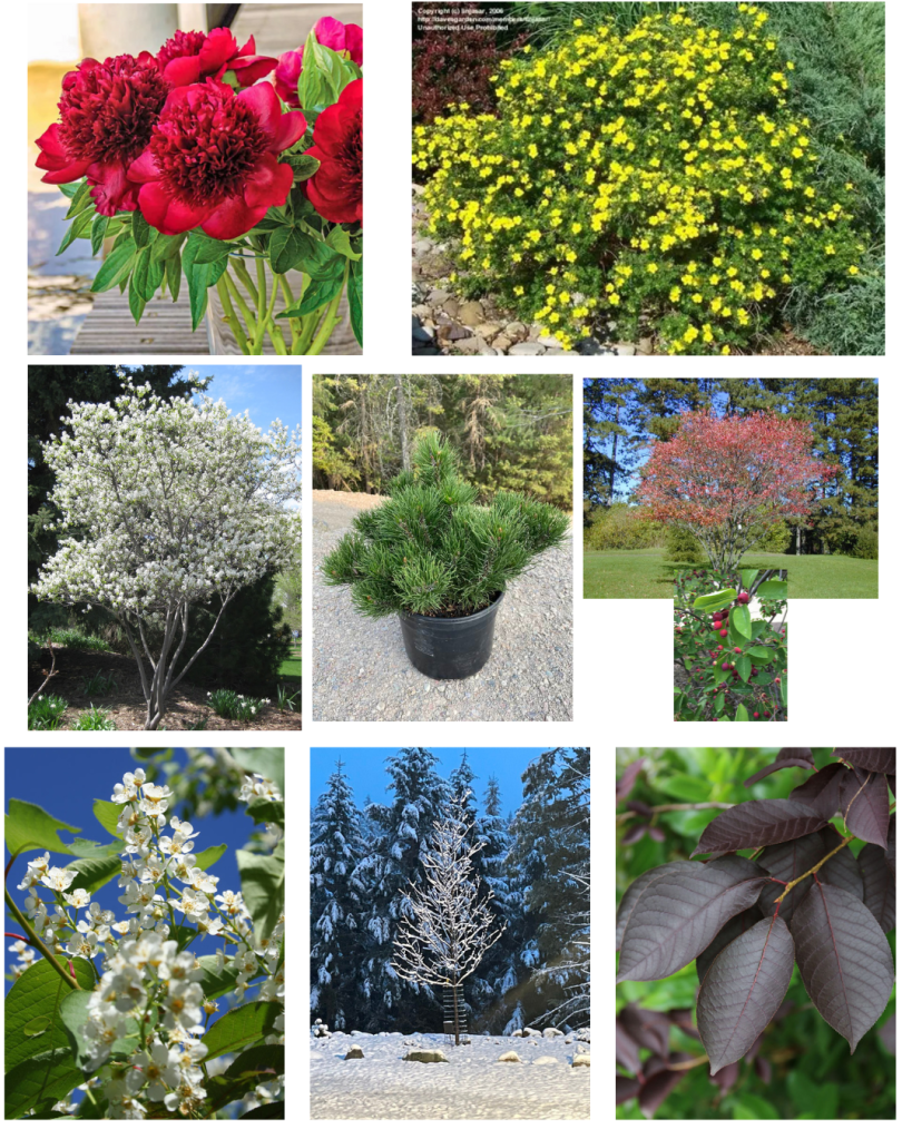 Farther east, down the slope we plan to add Serviceberries (Amelanchier alnifolia ‘Regent’). These native plants are upright and bushy and will grow up to 25 feet tall. These plants will sit at the start of our garden trail and add privacy from the road. In addition to providing shelter and food for wildlife, they also add interest three seasons of the year. They are pictured above showing spring blooms, fall color and berries in the middle row, flanking the mugo pine in the middle. We are also adding another Canadian Chokecherry (Prunus) as a focal point to the east garden. Repeating this second chokecherry will help unify both the driveway and east gardens. The chokecherry adds interest three seasons and is shown above in the bottom three pictures.