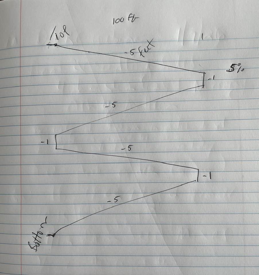 If the slope is around 25%, we’ll need three trails crisscrossing the hillside with a grade of 5% or a five-foot drop between every switchback. The trail will need two short switchbacks, which means we’ll drop one to two feet on the switchback, which will be steeper than the trail. We’ll use the switchbacks to help direct water off the trail, so it does not get washed out. I’ve included a rough drawing as an example, which you can see in the photo below: