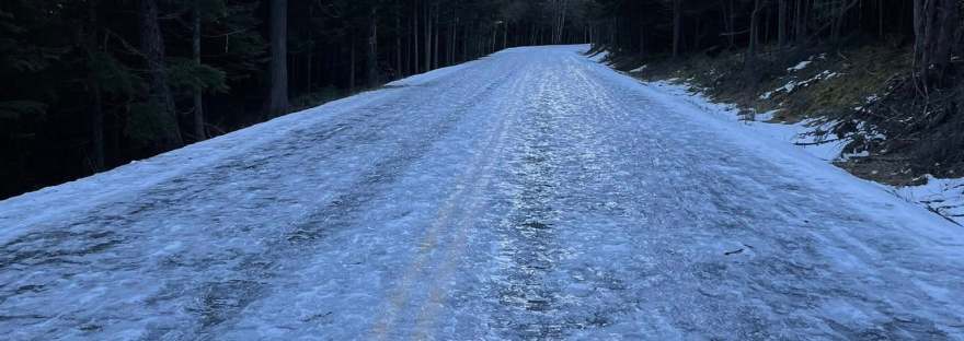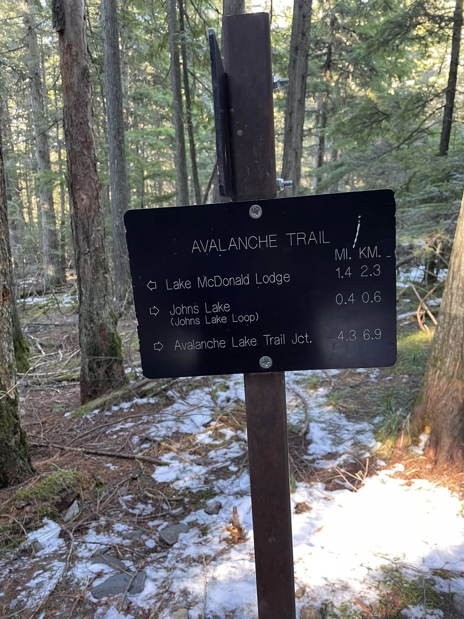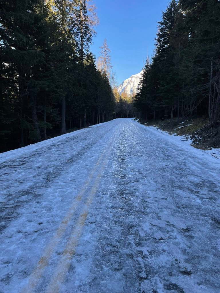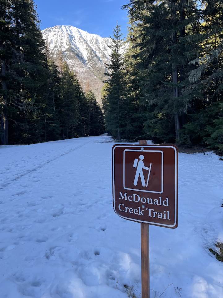 We had a beautiful, sunny and cool day to explore the trail. The GTTSR is open and plowed to Lake McDonald Lodge from West Glacier. There was plenty of parking, so we bundled up and put crampons on our boots. As you can see the road was covered in ice, so wearing crampons stops you from slipping or possibly falling. We walked GTTSR for about 1.3 miles east until we saw the sign for Johns Lake trail. You can see the spiked crampons in the picture below and I’ve included a link for anyone interested in purchasing a pair: