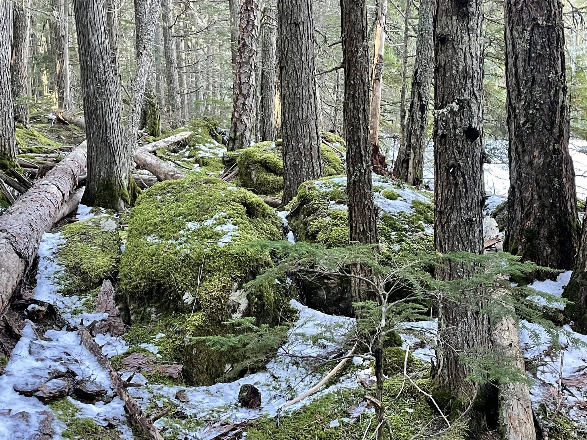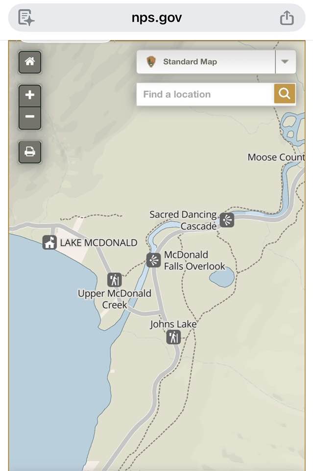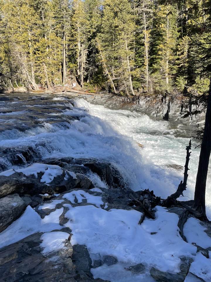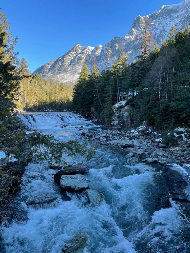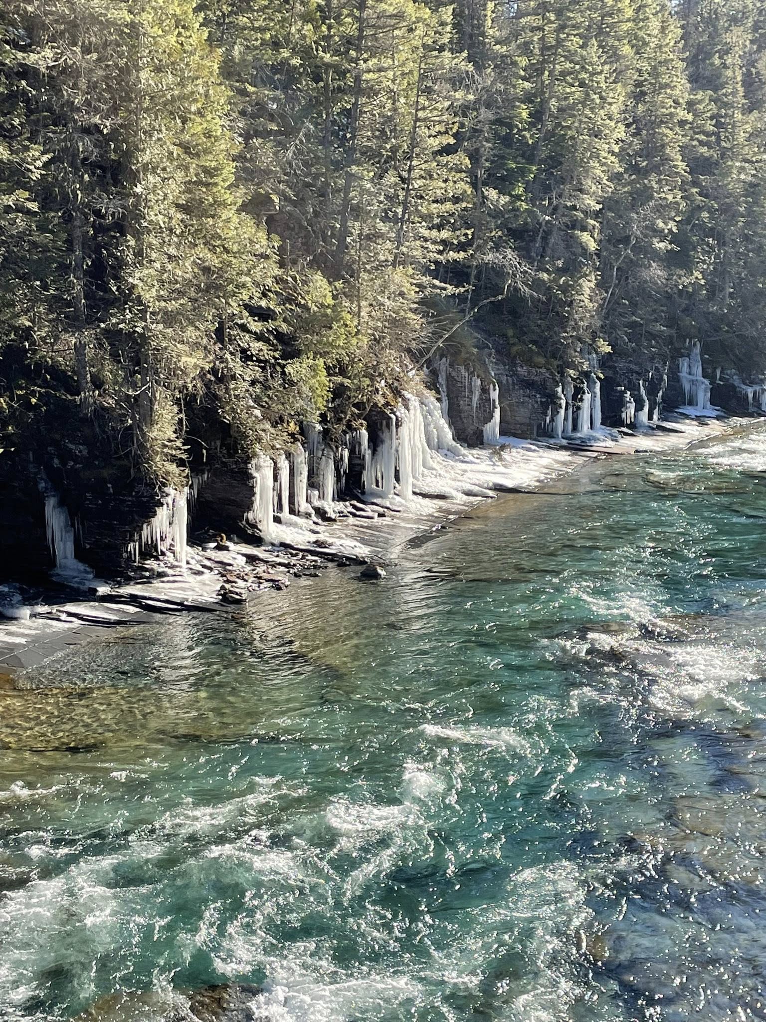 The Johns Lake trail is a popular hiking destination that offers a scenic route through Glacier National Park’s natural beauty. The trail includes a visit to Johns Lake, Sacred Dancing Cascade and McDonald Falls along the way. The trail is relatively easy, with a total distance of 3 miles and an elevation gain of 160 feet. It is a great choice for those looking for a less strenuous hike. Once off GTTSR, we walked through an old growth forest of red cedar and hemlocks. There were a few icy patches, but most of the trail was snowless and soft from falling pine needles. The area surrounding the trail was still very green, with moss covering boulders, trees and the forest floor.