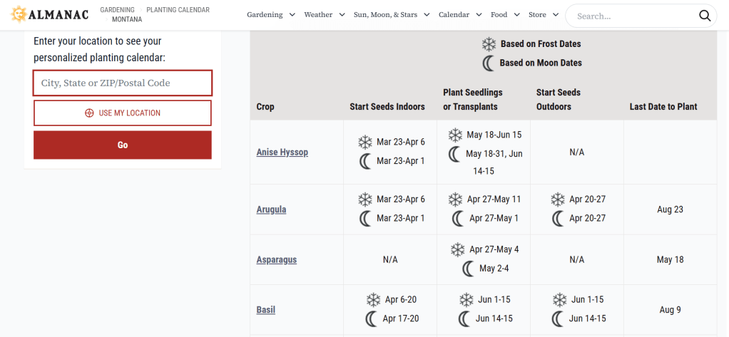 Find your specific zone by visiting 2026 Planting Calendar by Zip Code | The Old Farmer’s Almanac link: Old Farmer’s Almanac Planting Calendar and Guide 2026 by Zip Code