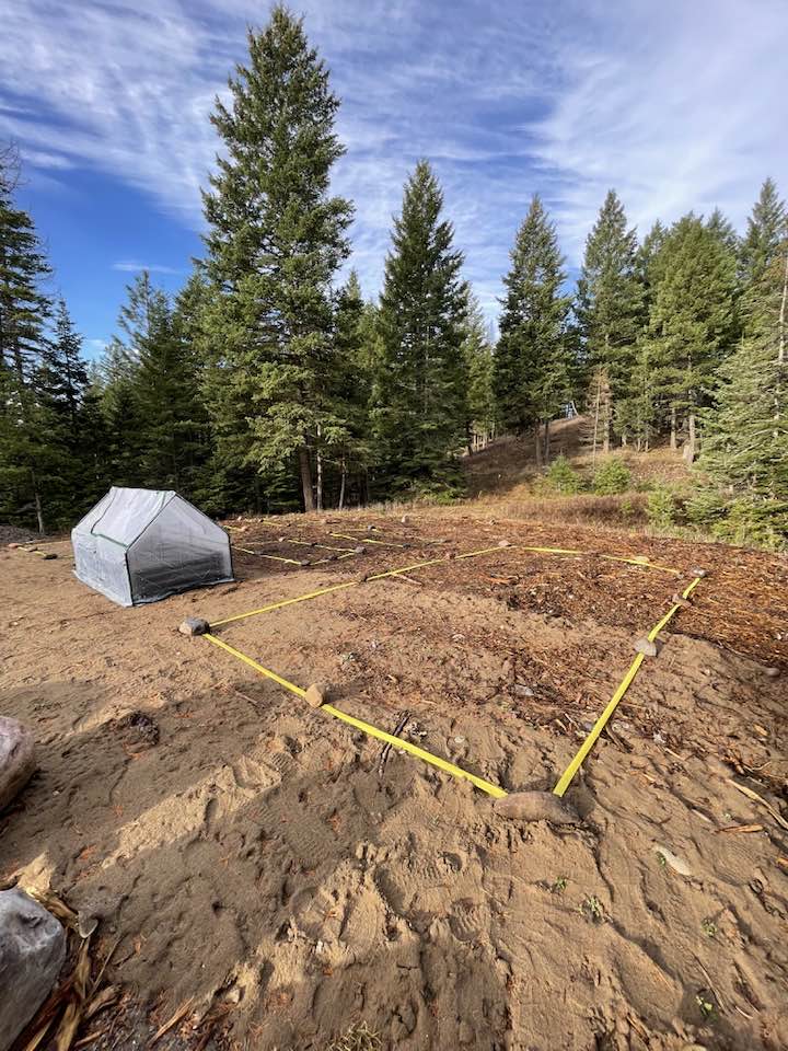 The fruit trees will be planted west of the greenhouse and raised beds shown below: