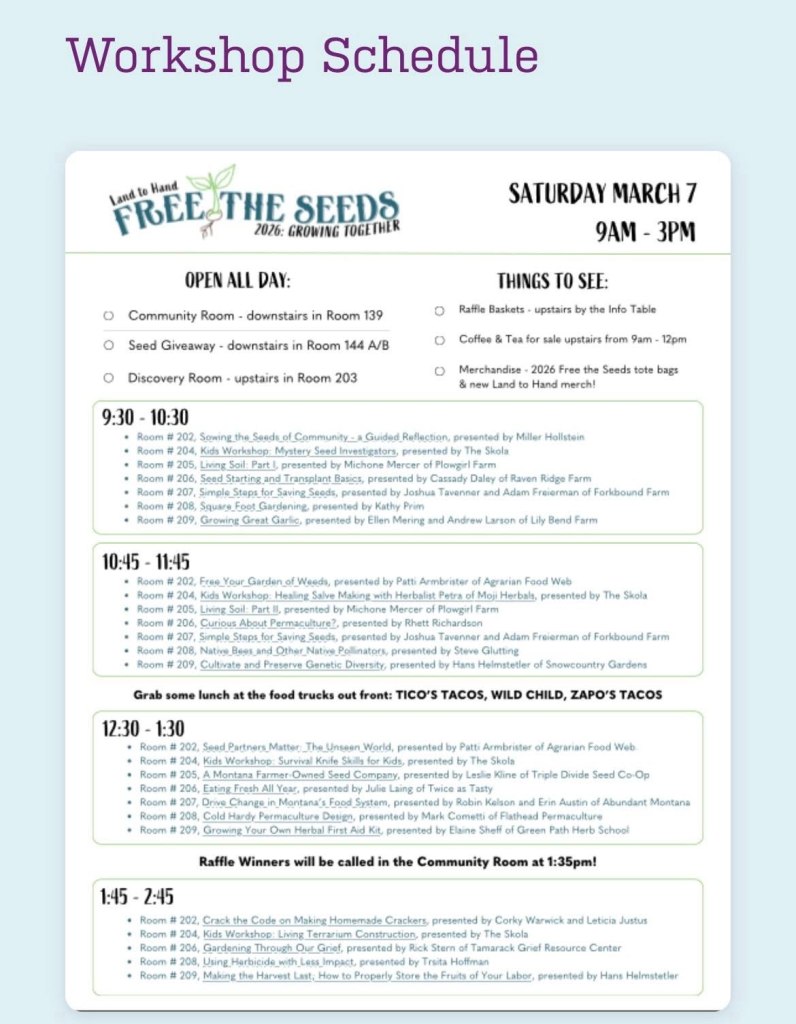 Getting started can be very intimidating, so we were thrilled to attend Land to Hand MT’s Free the Seeds/Growing Together event. Land to Hand MT is a local nonprofit that hosts this event annually. It is a free, educational and family-friendly event about community food systems. The event is full of interactive workshops, activities, seed sharing, and community building. I’ve always said that plant people are the nicest people, and we’ve found that to be true in NW Montana too. We attended the Square Foot Gardening workshop and spent time speaking with various folks in the community room, which featured small local food and flower farmers, Center for Native Plants nursery, local nonprofits and many more.