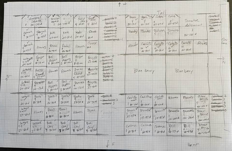 Below is our current planting plan for the edible garden, which includes how many plants per square foot(s) and the number of days to harvest from seed: