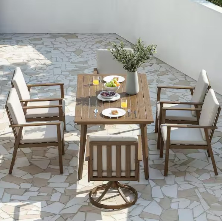 Now that spring is here, we purchased an outdoor dining table and chairs. We chose a dining set over a seating area because we will use it more. The aluminum dining set from Home Depot is lightweight, fire-proof, and has an attractive “teak” finish. The comfortable chairs come with cushions and two of the chairs swivel and rock.